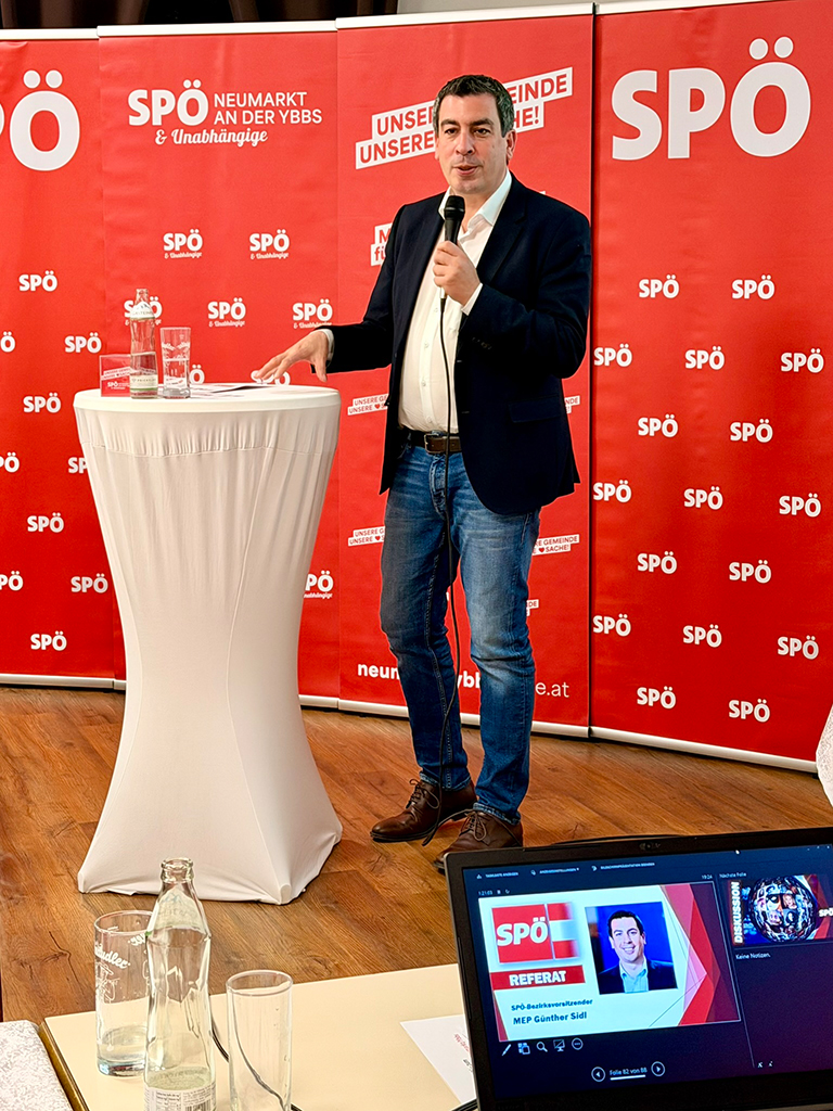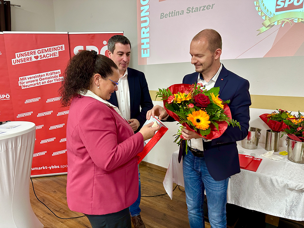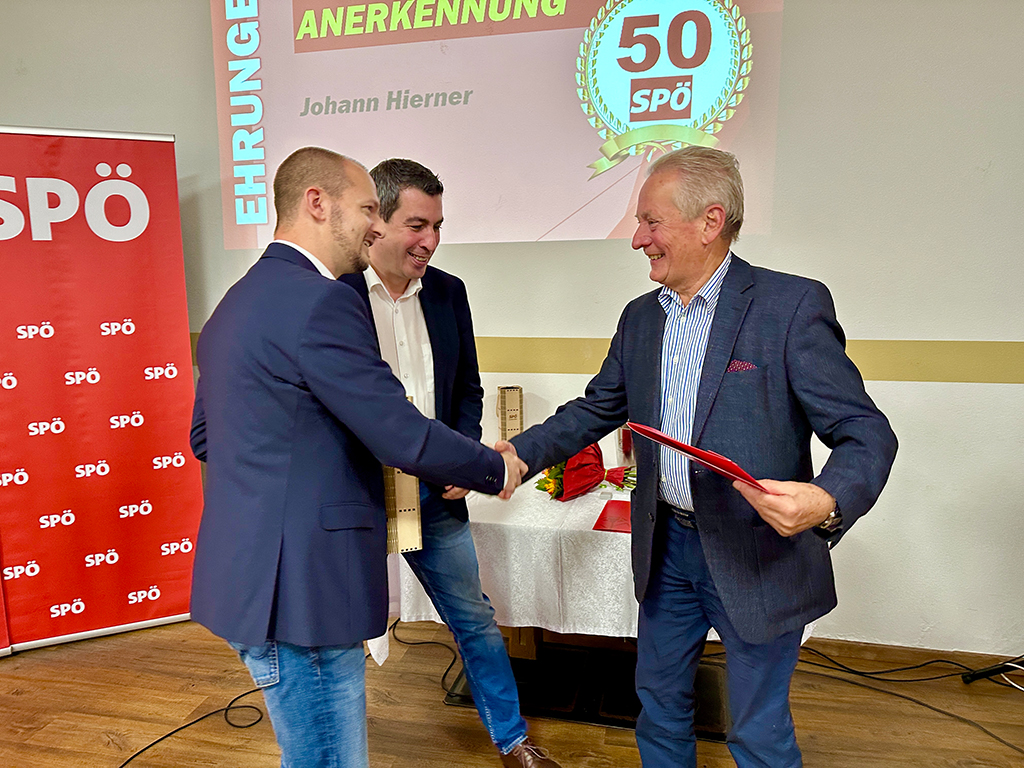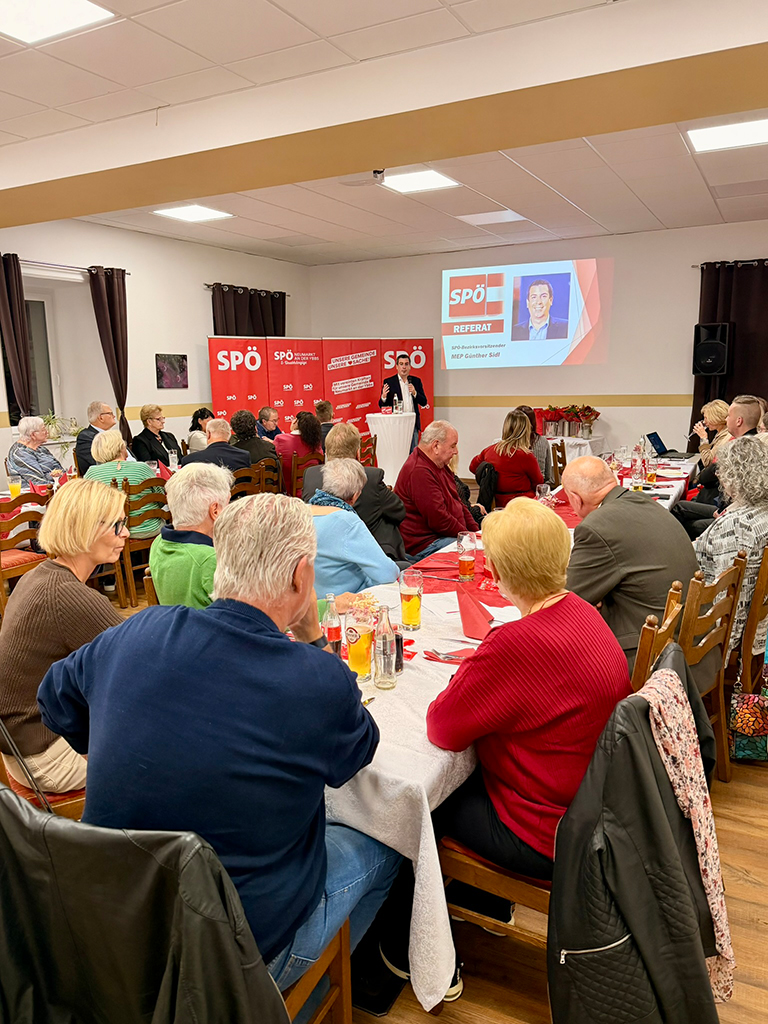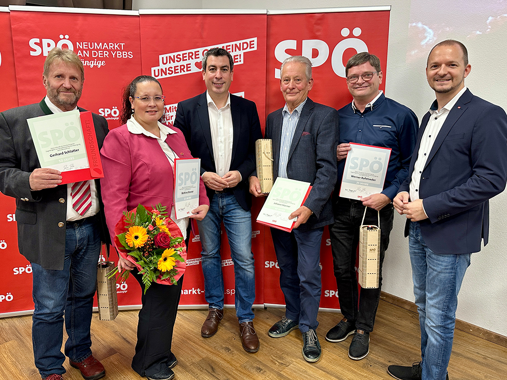 Die Mitglieder konnten an diesem Abend auch den spannenden Ausführungen des Referenten, SPÖ-Bezirksvorsitzenden MEP Günther Sidl, folgen. Anschließend wurden langjährige Parteimitglieder geehrt: Bettina Starzer und Werner Rafetseder (beide 25 Jahre), Johann Hierner und Gerhard Schlatter (beide 50 Jahre).